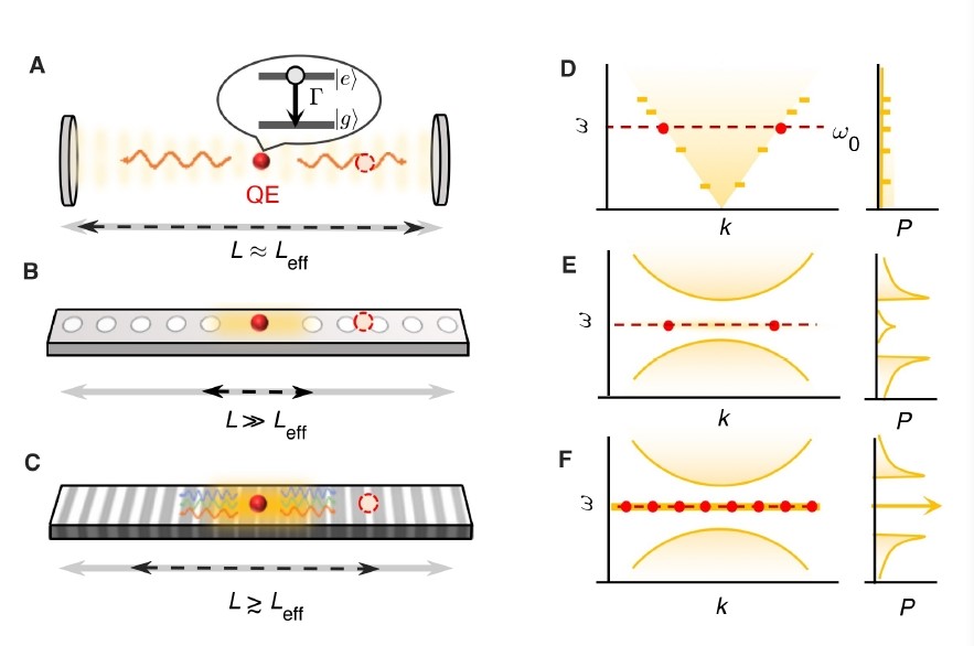 图1:量子发射器在不同微腔体系中示意图。 A-C. 量子点在传统法布里-珀罗微腔,一维光子晶体缺陷腔,摩尔光子晶体微腔中示意图。E-F. 左右分别表示量子点在不同体系中的色散关系及态密度。