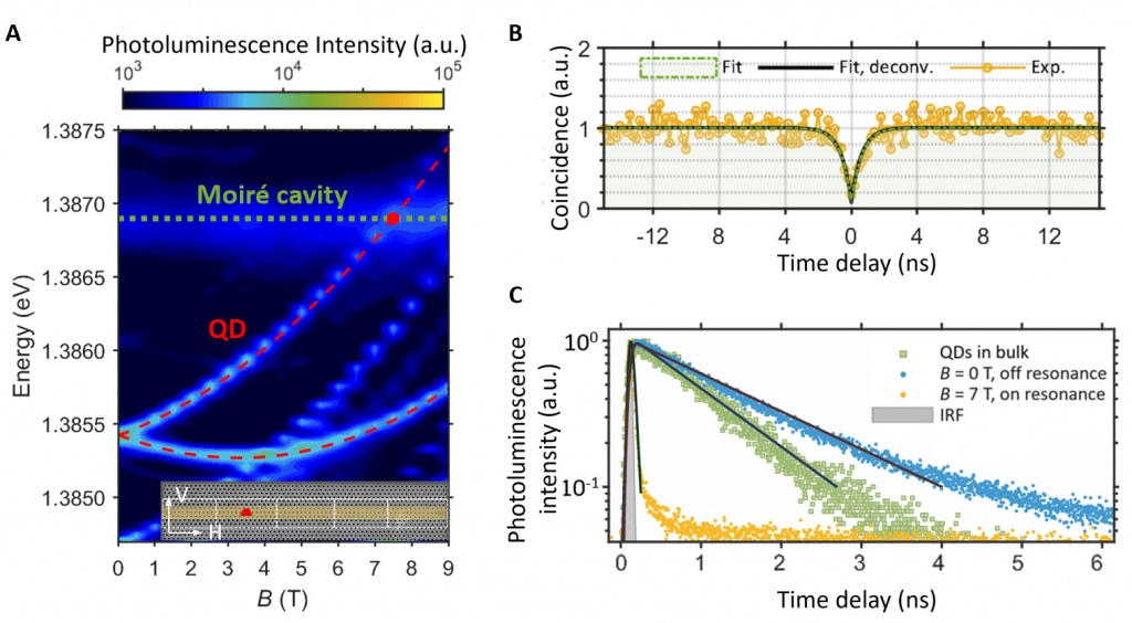 图3. 莫尔平带腔调控量子点单光子发射。 A. 磁场相关的荧光光谱。B. 二阶相关测量。 C. 时间分辨荧光谱